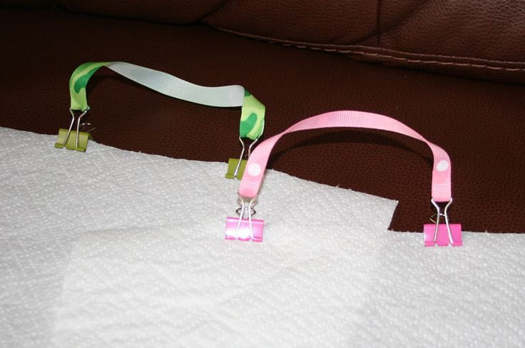 - Le dernier item est manquant sur la photo. J’avais trouvé l’idée sur internet et je la trouvais vraiment pratique pour avoir une bavette sous la main en 2 secondes! Il suffit de coller aux 2 extrémités d’un ruban 2 petites pinces (un peu dans le même principe que chez le dentiste!) et ensuite on n’a qu’à mettre un essuie tout, du papier brun ou encore une débarbouillette!